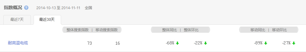 從上圖可以清晰的看出,耐高溫電纜的需求量確實(shí)在下滑,不論在PC(電腦終端)端的搜索量還是在移動終端(手機(jī)、平板電纜等)的搜索量都呈現(xiàn)不可逆的下滑趨勢,最近30天耐高溫電纜的整體搜索指數(shù)為73,移動搜索指數(shù)為16。整體同比下降68%、環(huán)比下降22%,移動同比下降89%、環(huán)比下降27%。預(yù)計(jì)未來的4~5個月內(nèi)耐高溫電纜的指數(shù)將不會有明顯的改觀。這個時候人們的耐寒電纜的需求又了一定的提高,然而在每年的其他季節(jié),耐寒電纜的搜索指數(shù)是相當(dāng)?shù)牡偷模蚓褪侵袊粚儆跇O寒國家,所以耐寒電纜的需求量就較小。其次生產(chǎn)工作中一般會產(chǎn)生的都是高溫作業(yè)環(huán)境,很少會產(chǎn)生低溫作業(yè)環(huán)境,所以耐高溫電纜一直是人們關(guān)注的線纜種類之一。